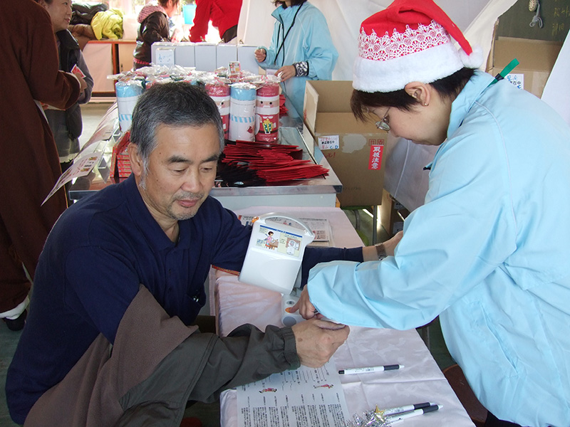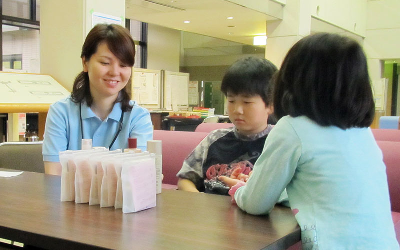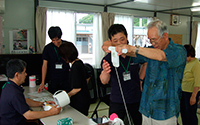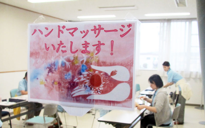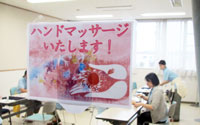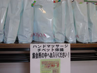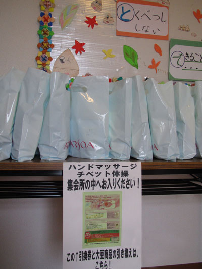 ハンドマッサージ、ビオクラ食養本社商品(豆乳、大豆、甘納豆)の配布を行う。