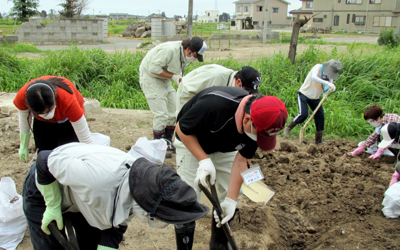 - 宮城県仙台市宮城野区 被災者宅にて、津波により畑に運ばれてきた石・ガラス片の除去、また、津波により、土が塩水で固められた場所を耕す。