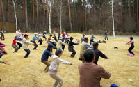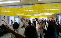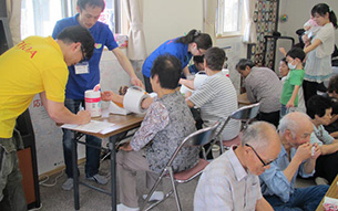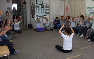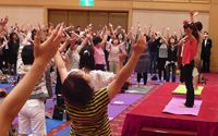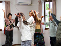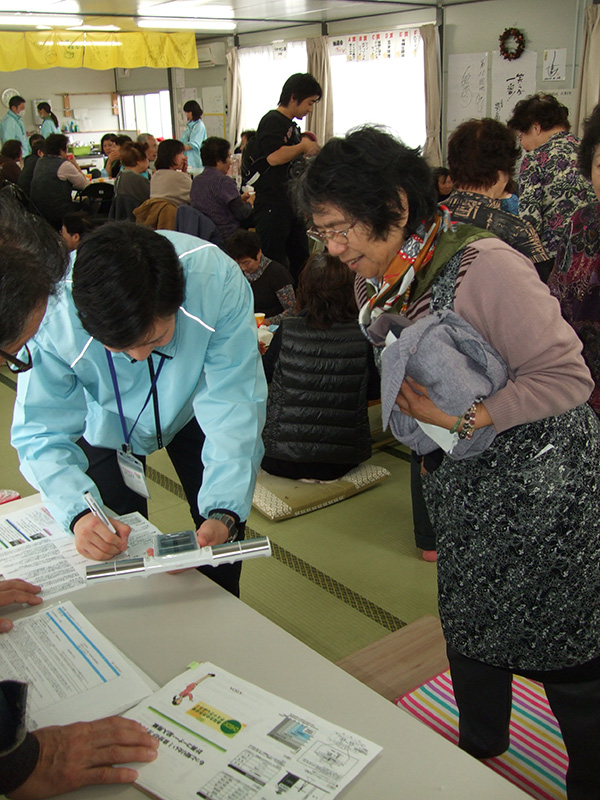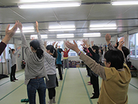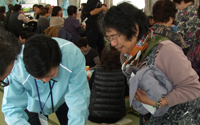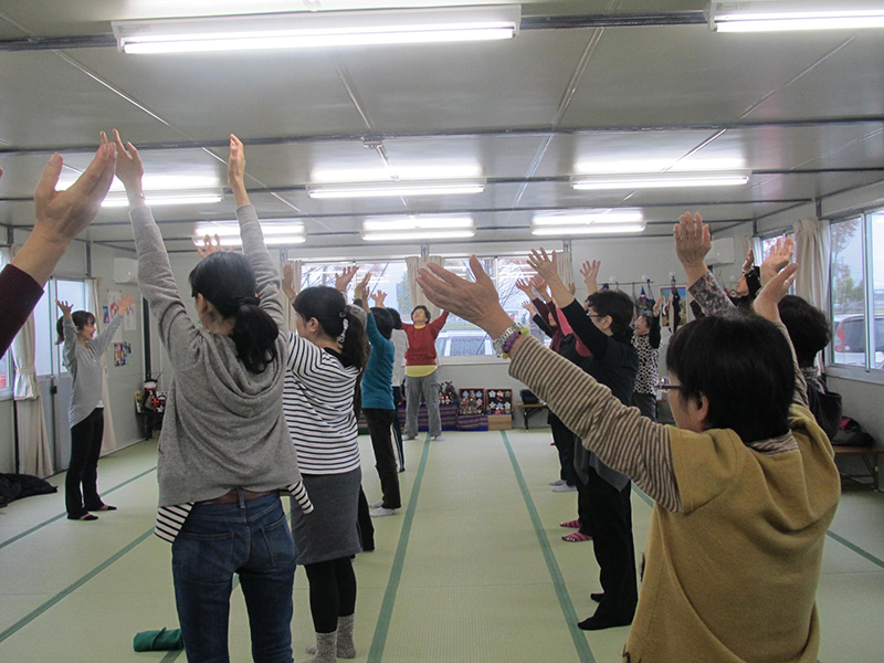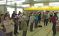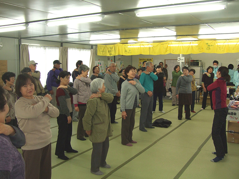 大型イベント施設「福島ビックパレット」となりに建設された仮設住宅にてハンドマッサージ、女優の越智静香さん指導によるチベット体操。