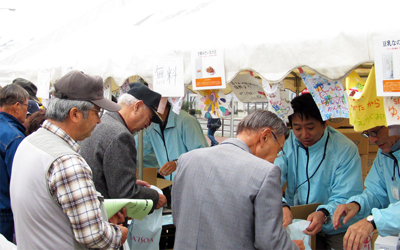 ビオクラ食養本社の商品(豆乳、塩茹で豆、甘納豆)を配布を行う。 - 2011年11月20日