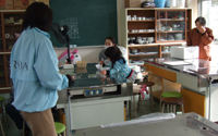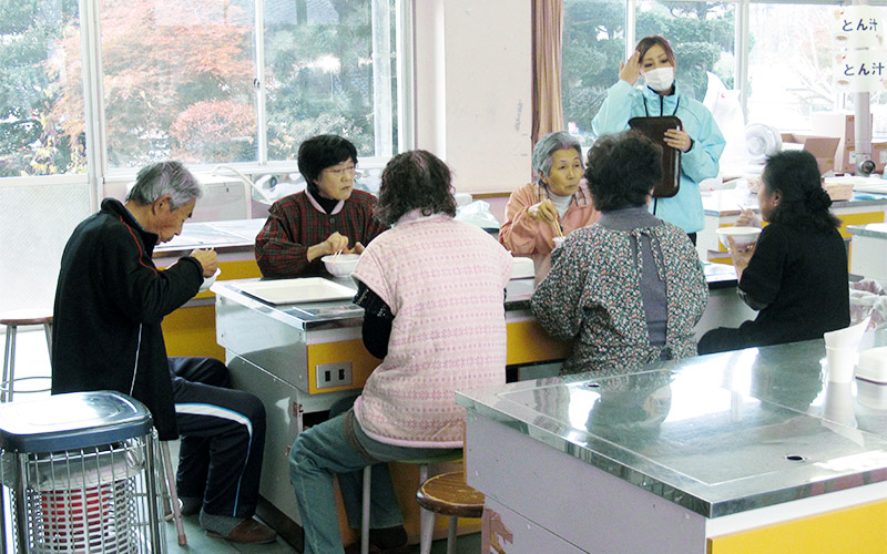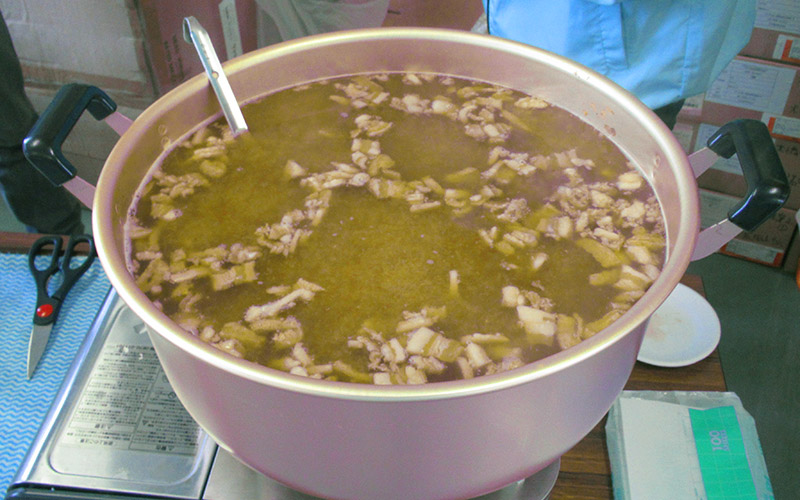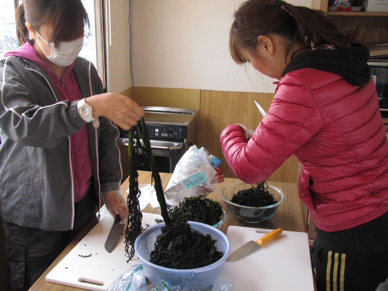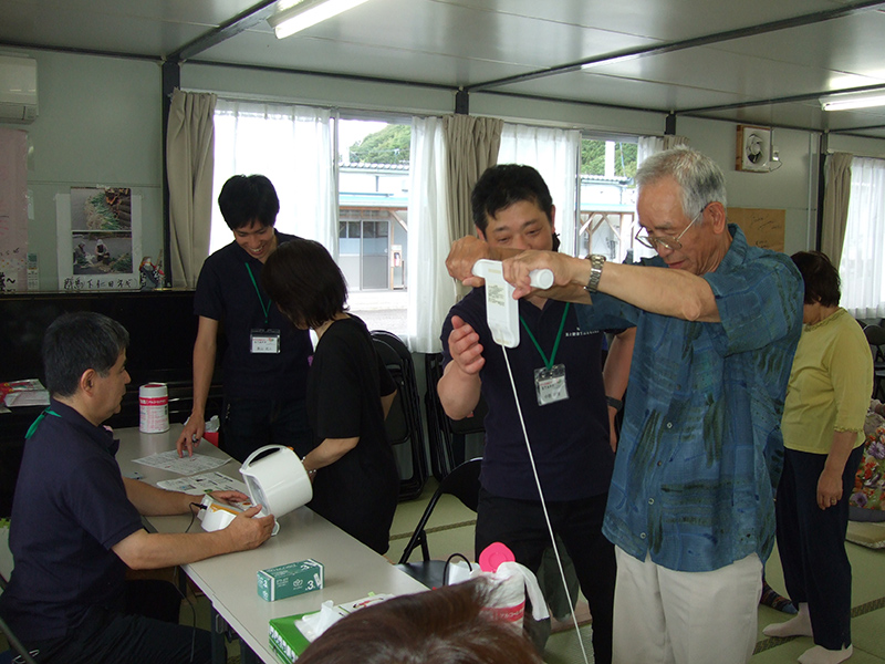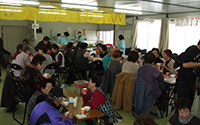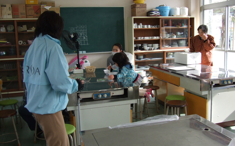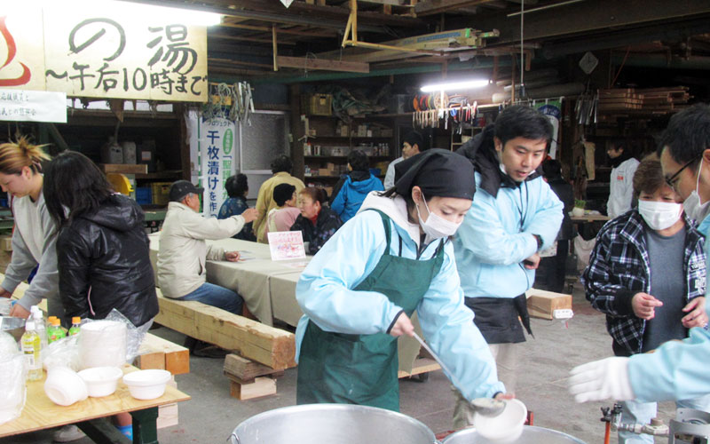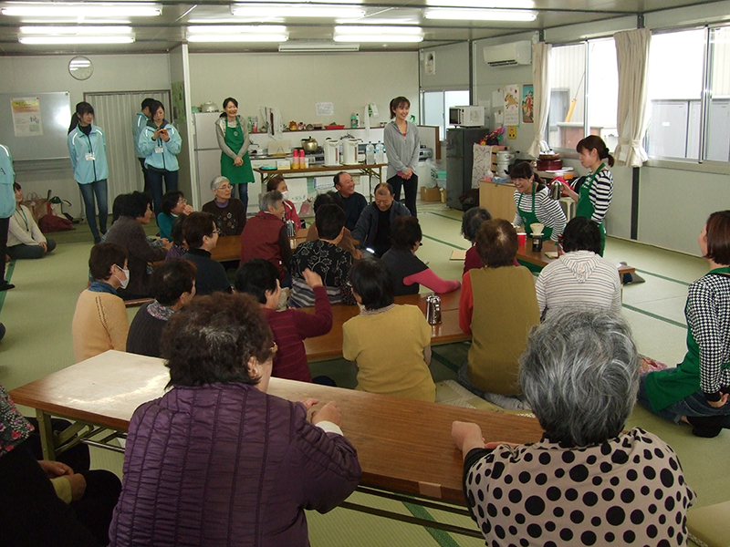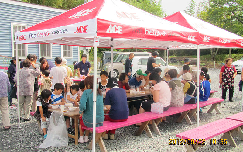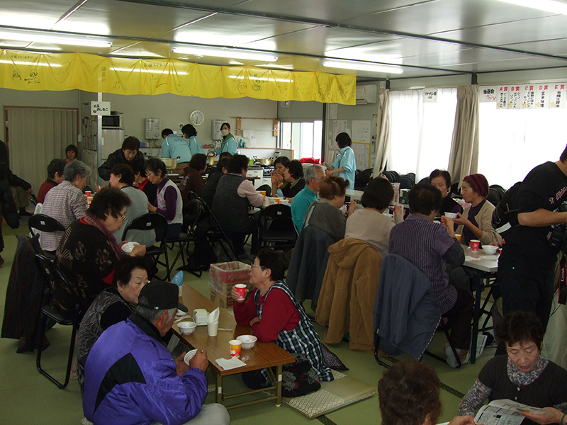- 陸前高田市立米崎中学校のグラウンドにある仮設住宅の方々に、震災の影響で学校としては使われていない米崎中学校の調理実習室をお借りし、とん汁の提供とビオクラ食養本社の食材、アルソアのシャンプー等を景品とした抽選会を行いました。