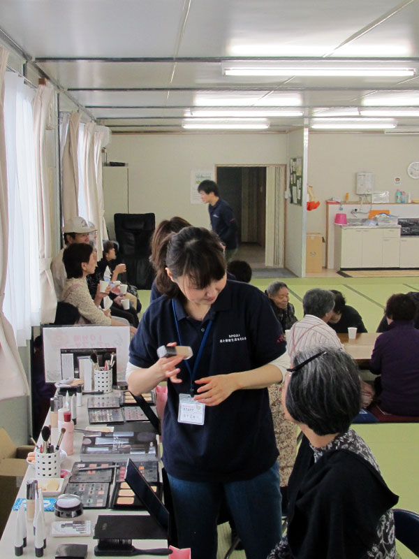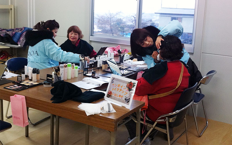 アルソアも陸前高田市での活動の中で、ヤルキタウンの熊谷さんと出会い、そういった想いに共感して活動に協賛し、今回のオープニングセレモニーの運営協力をさせていただきました。セレモニーの中では、アルソアと交流のある女優の越智静香さんに詩の朗読をしていただき、地元の方々が涙する姿もみられました。 セレモニー終了後は、施設の一角をお借りしてワンポイントメイクや、ビオクラ食養本社のスイーツ、穀物コーヒーなどの温かい飲み物をご提供いたしました。 ワンポイントメイクを試された方の中に、アルソアユーザーの方がいらっしゃり、喜んでいただいたことや、久しぶりにメイクをして楽しい気持ちになったと嬉しそうに話してくださった方などのお声を聞くことができてとても嬉しかったです。 今回のプロジェクトの運営に協力させていただき、心のケアの重要性を改めて考えさせられました。