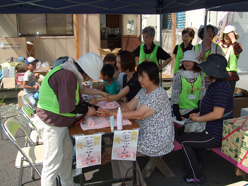 美と健康生活を考える会では、心から心へ、手から手へ、今すぐに会って、触れて、会話をして、やすらぎを届ける支援活動をコンセプトに、「やすらぎ巡回サポート」を立ち上げました。被災地の避難所等を巡回し、支援活動に取り組み、癒しややすらぎをお届けします。