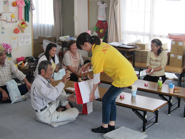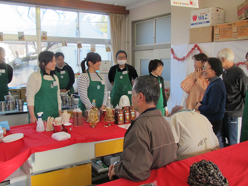 - 宮城県石巻市 仮設石巻開成12団地にお住まいの方々へ、女優の越智静香さんによるチベット体操、スターバックスの皆さんによるコーヒーの淹れ方講座、アルソアによる 粘土キャンドルづくり、スターバックスの皆さんの協力のもと、カフェを行いました。