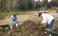 被災者宅にて、津波により畑に運ばれてきた石・ガラス片の除去、 また、津波により、土が塩水で固められた場所を耕す。